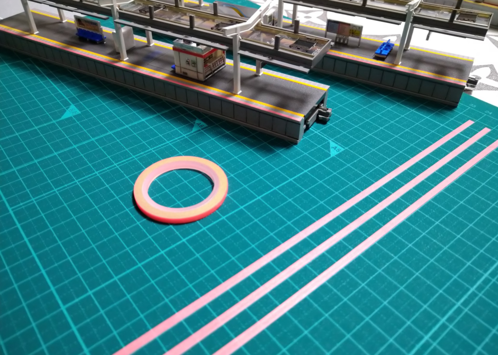 実際のホームを観察すると、最近はホーム端が赤く塗られていることが多い気がしますので、マスキングテープを細く切って貼り付けてみました。うん、まぁ悪くないかな。