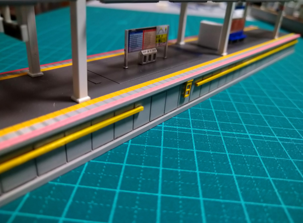 落下時にホームに上るステップは、1mmのプラ角棒を黄色く塗って貼り付け。これは別に角棒でなくても、厚紙でも、ランナーの余りでも良かった気がしますね。