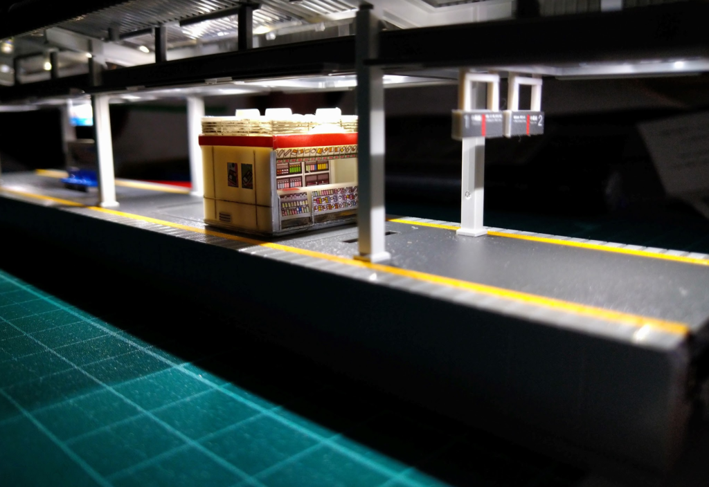 そして、順番が前後しますが、売店。Tomixの照明付きホームは売店やコンビニの中にもLEDが入っているのですが(その分価格も高価ですが…)、KATOは入っておらず、そのままだと売り場が暗いのです。。