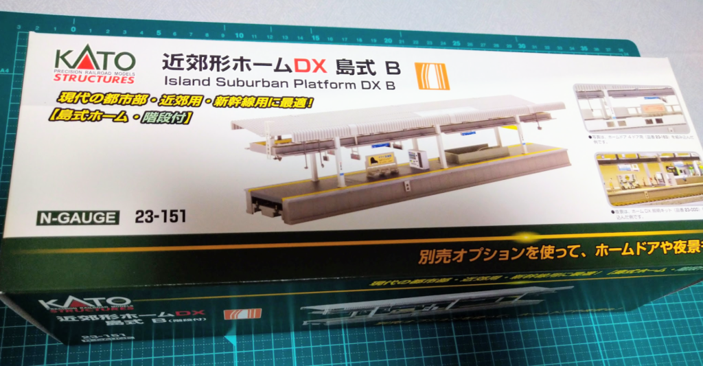 使用するのはこちら。KATOの近郊型ホームDXです。写真の島式Bの箱ですが、島式セット、階段のない島式Aなど、バリエーションは色々。箱にも記載がありますが、オプションで照明をつけることができます。