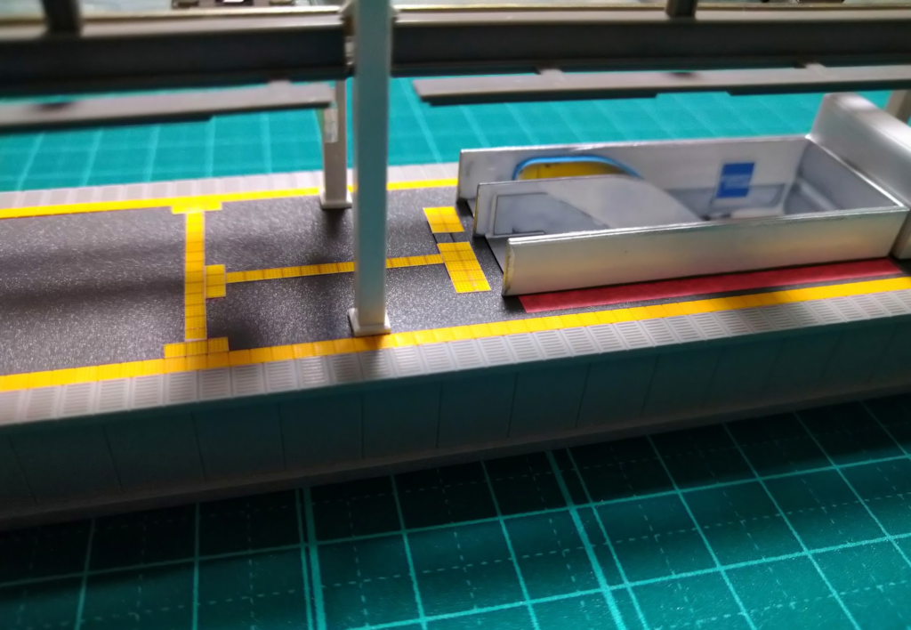 階段横のホームが狭くなっているところは、手元にあった赤いマスキングテープを貼り付けてみました。立ち止まらないでくださいエリア、のつもり。