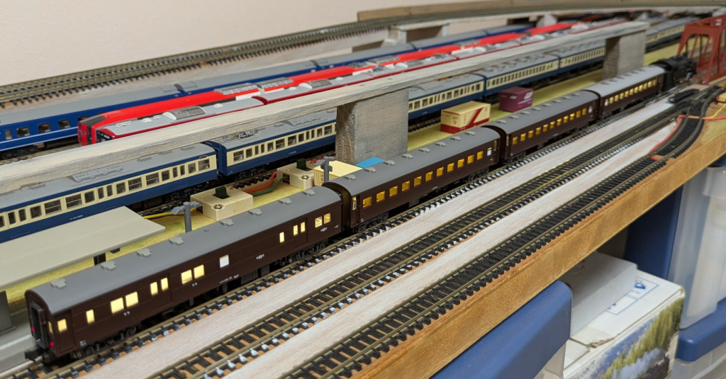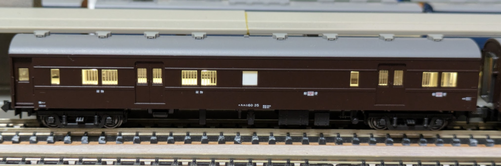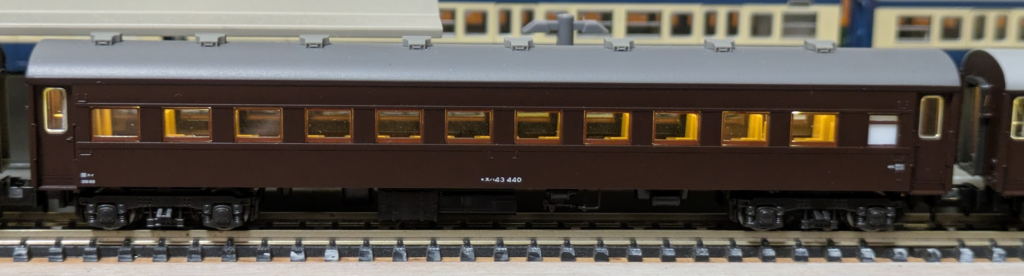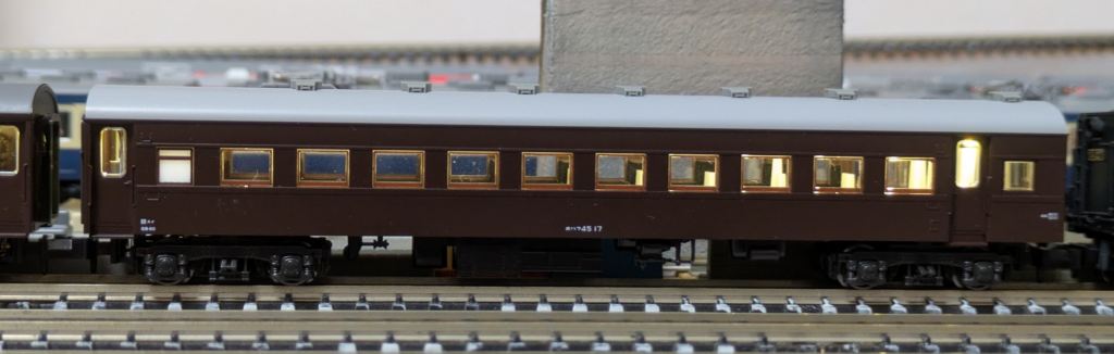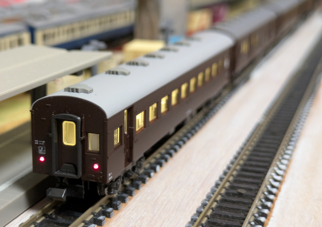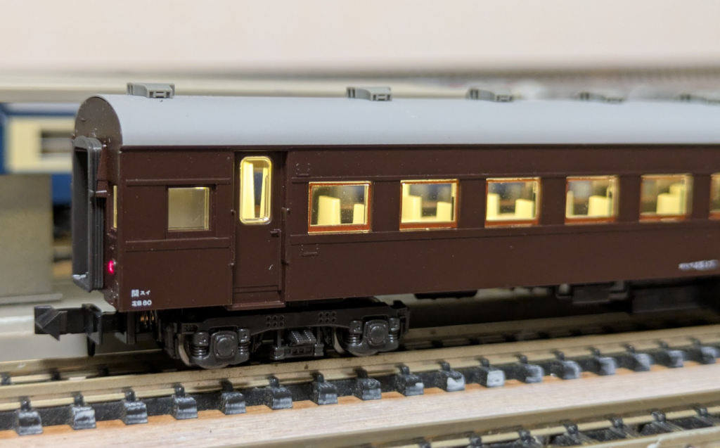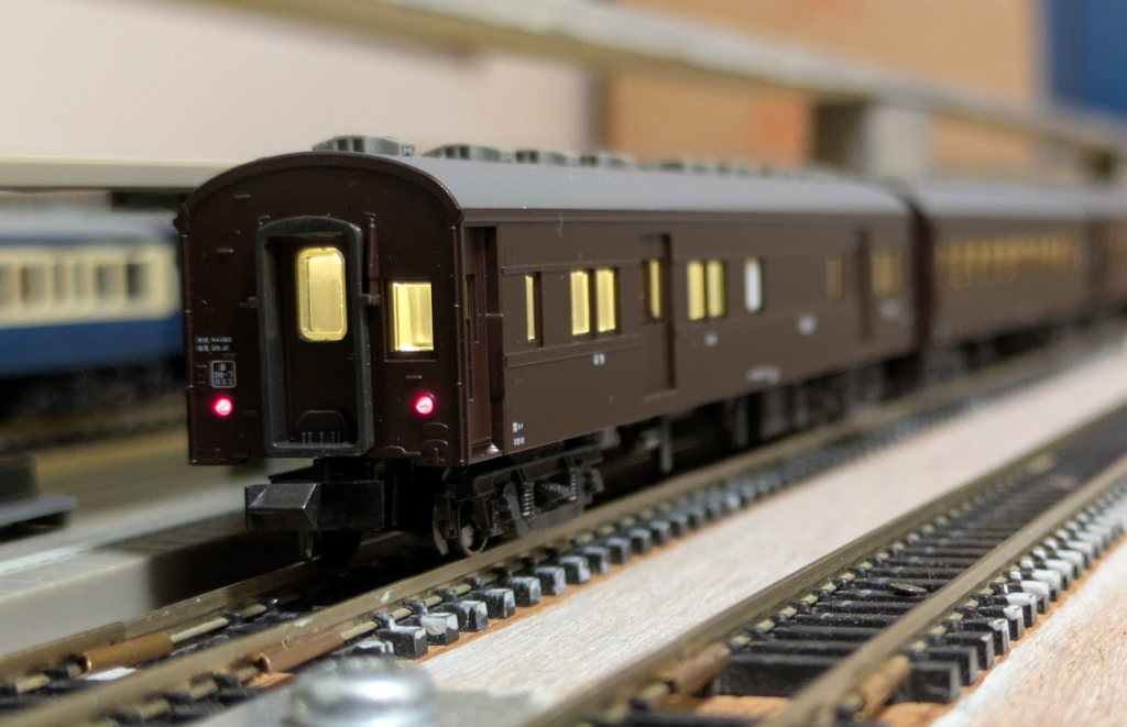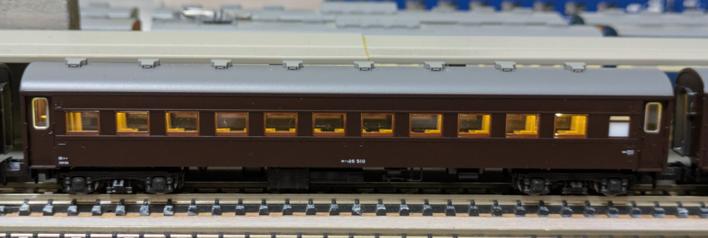 今回、室内灯について黄白色と電球色という2つの色を使用していますが、これは意図した色の使い分けではなく、すべて電球色にするつもりだったところ、室内灯の電球色セットの中に黄白色が混入した製品を引いてしまった、という偶然によるものです。ポポンデッタからは、色が間違っていることは事実であり、申し出があれば正しい色のものに交換するというリリースが出ていましたが、交換するのも面倒なのと、1両1両に個性があるのも旧型客車っぽくて良いかな、と思い、そのままにしています。
