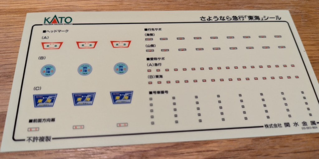 急行東海、普段はヘッドマークなどはなく、地味に走っていましたが、特急への格上直前はヘッドマークやグリーン車の帯が復活しており、模型もさよなら仕様なので、ヘッドマークのシールが付属し、グリーン車帯も復活状態で製品化されています。